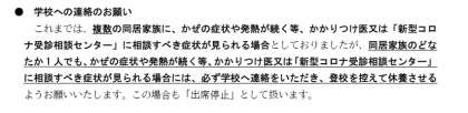 保護者のみなさまには、新型コロナウイルス感染症に対しては、これまで通り、お子様の日常の健康状態の把握や感染症予防をお願いしているところですが、次のとおり、学校へ連絡いただき、登校を控えていただく基準を一部改定いたしますので、よろしくご理解ご協力をお願い申しあげます。