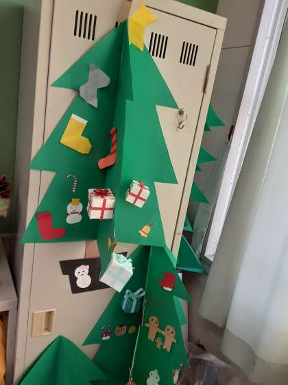 教室後ろを掃除道具ロッカーには、素敵なクリスマスツリーの掲示物が飾られていました