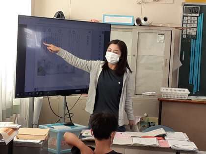 2年生では国語科で「お手紙」を学習しています。1組では、手紙が欲しいけどもらえないのでがまくんと、その話を聞いているかえるくんの気もちについて考えましたワークシートで問われている部分はどの文章に書かれているのか、児童は文章をしっかり読んで探していました。大型テレビに映るデジタル教科書で確認しながら、物語文を読み取っていました。