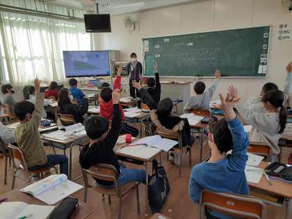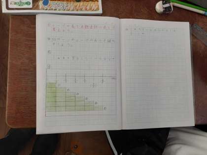 3年生は算数科で「分数」を学習しています。1組では、1mのテープを5等分した時の1つ分の長さの表し方について考えていました。前時までに分数については学びましたが、「5分の1m」のように長さも分数で表すことができることを学びました。分数も数字として扱うことに違和感をもたないで抵抗感なく学習している児童に感心しました。