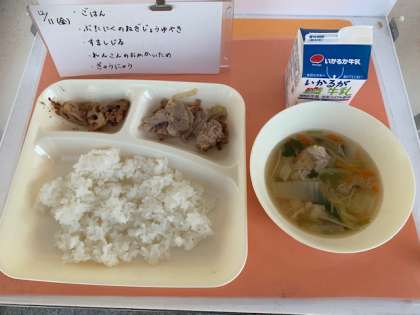 12月11日(金)の給食は、ごはん・牛乳・豚肉のねぎじょうゆ焼き・すまし汁・レンコンのおかか炒めです。レンコンは、おなかの調子を整える食物繊維や風邪を予防する効果があるビタミンCを多く含みます。レンコンのビタミンCは、でん粉に守られているため、熱に強いのが特徴です。一緒に炒められたおかかが、いい味を出して、サクサクレンコンをより美味しくしています。