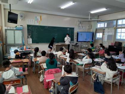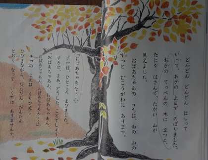 1年生では、国語科で「おとうとねずみ チロ」を学習しています。チロになったつもりで、どんどん走って丘の上に立って、谷をはさんだ高い山のおばあちゃんの家へおばあちゃんを呼びます。何人かチロになったつもりで前に出てきて挑戦してくれました。丘の上まで走ったつもりで声を出していました。「おばあちゃあん……。」