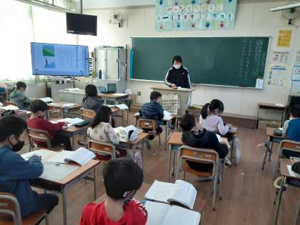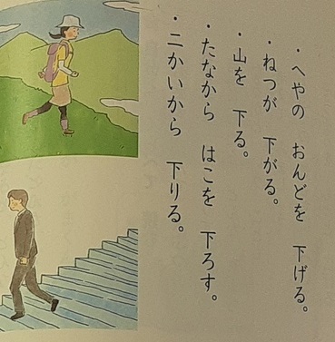 2年2組では国語科で「おくりがなに 気を つけよう」を学習していました。漢字の読み方が何通りもある場合、送り仮名に着目すると読み方がわかることが少なくありません。この単元では。「下」の場合、「下がる」と「下る」のような漢字を学びます。「入る」と「入れる」のように、これまで登場した漢字でも児童は読みに迷った経験があるようです。この機会にしっかり学んでほしいです。