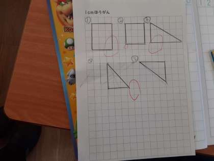 2年1組では算数科で、2学期の復習問題に取り組んでいました。定規を使って方眼紙に三角形や四角形を描きました。目盛りをしっかり見て描けていました。