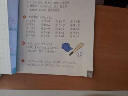 次はかけ算の復習です。「チョコレートを4人に6個ずつ配ります。チョコレートは全部で何個入りますか?」の問題です。「かけ算だ。簡単だな。4×6=……。」と思ったら、ちょっと待って。これは一種のいじわる問題と言えるでしょうか。4人の6つ分でしょうか。6個の4つ分でしょうか。