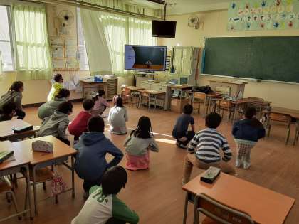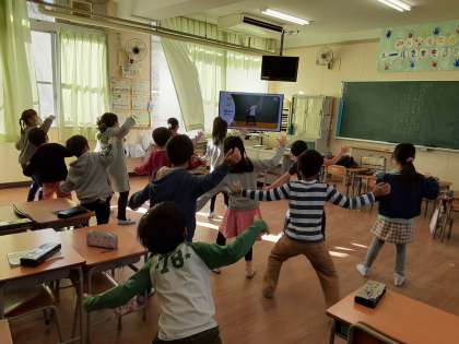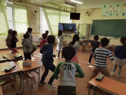 2年2組では体育科でビデオに合わせて「運動神経がよくなるダンス」に取り組んでいました。音楽に合わせて映像を観ながら同じように体を動かしていきます。横や上下に単調な動きに見えても、何度か繰り返すと結構いい運動になるようです。音楽の最後には、各自が決めた決めポーズです。終わって、みんな笑顔でした。楽しみながら体を動かすことができました。