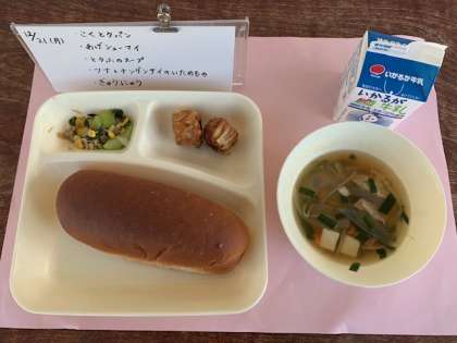 12月21日(月)の給食 公開日 2020/12/21 更新日 2020/12/21 お知らせ 12月21日(月)の給食は、黒糖パン・牛乳・あげシューマイ・とうふのスープ・ツナとチンゲンサイのいためものです。とうふのスープは鶏がら中華スープで味つけしています。とうふだけでなく、しいたけ・鶏肉・にんじん・たまねぎ・もやしも使用しており、たくさんの具が楽しめます。 いいね(0)