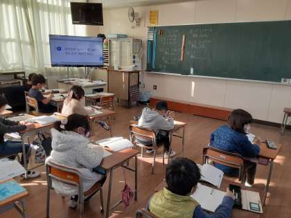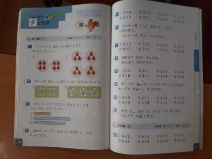 2年生では算数科で、2学期の復習をしています。1組では「しっかりチェック」のページで、主に「かけ算」の復習問題をこなしていました。九九を覚えているときには、すぐに答えが出ないために九九が途中で止まってしまうこともあったようですが、だいぶ九九が出てきているようで、たくさんの練習問題がありましたが、次々に解いていました。