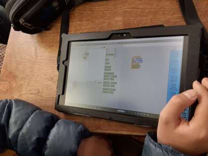 5年生では、算数科で「プログラミング」について学習していました。コンピュータに「〜のようにしてほしい」と仕事のやり方を書いたものを「プログラム」といい、プログラムをつくることを「プログラミング」といいます。本時では、三角定規やコンパスを使わず、scratchというプログラミング言語を使って、コンピュータで多角形を書くプログラムを考えていました。入力の仕方次第で簡単に正確な図形が描けます。児童も、プログラムする楽しさを味わっているようでした。