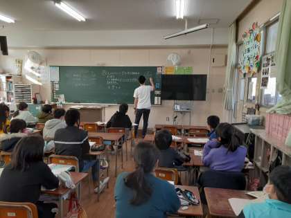 6年生では、算数科で6年間の復習を進めています。「ガソリン1Lで3分の20km走る車があります。ガソリン5Lで何km走りますか」という問題でかけ算なのかわり算なのかを、どのように説明すればいいのか話し合っていました。「1dlで4分の3平方メートル塗るペンキがあります。このペンキ5分の2dlでは何平方メートル塗ることができますか」などの問題でも迷います。「あわせて」は「たし算」、「のこりは」は「ひき算」のようにはいかないので、図を描くなどして確実に式を立てられるようにがんばってほしいです。