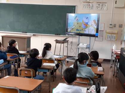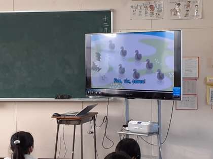 1年生は、朝の時間に外国語活動をしていました。Mother gooney birdは、今朝も子どもたちの数を数えます。児童はビデオに合わせて「one two … seven」口ずさんでいました。発音もなかなかのものでした。