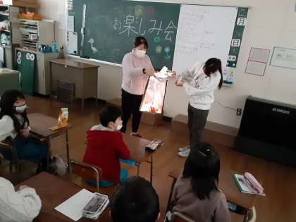 4年生では学級活動でおたのしみ会をしていました。星合先生の手品から始まりました。星合先生のハンドパワーで銀紙が透き通りました。次に体育館で活動しました。フラフープで縄跳びや両手回しなど芸を披露するグループがありました。そして、大縄跳びに挑戦していました。6・7人並んで大縄を跳びます。3回以上はなかなか続かないものです。それでも、疲れを知らず何度もチャレンジしていました。この後、卓球や劇をするようです。子どもたちはみんな、いきいきとして笑顔でした。