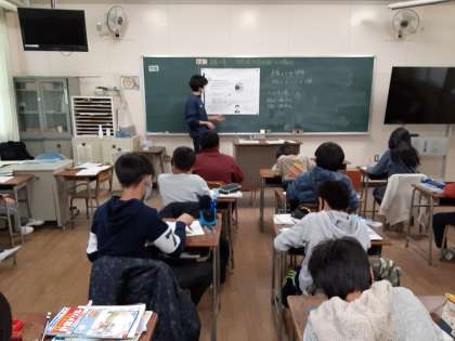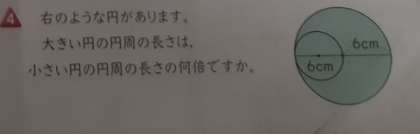 直径と円周の長さの変わり方 公開日 2020/12/24 更新日 2020/12/24 お知らせ 5年生では算数科で、円の直径が2倍3倍になると、円周の長さがどのように変わっていくのか調べていました。「円周も倍3倍になる」「比例している」「□(円周)=〇(直径)×3.14」のように子どもたちから意見が出てきました。 その後、下記のような応用問題が待っています。うまく解けるでしょうか。直径と円周の関係を正しく理解して考えてほしいと思います。 いいね(0)