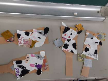 1年生の教室の後ろに図画工作科で作った羽子板が飾られていました。個性的な「丑」さんが描かれていました。
