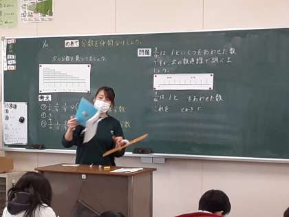 4年生では算数科で「分数」を学習しています。本時では、分子が分母より大きいか小さいかで「真分数」「仮分数」と分けられることを学びました。