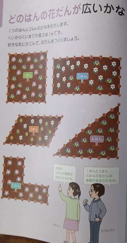 5年生は算数科で「面積の求め方を考えよう」の学習を進めます。本時では、5種類の花だんがあり、どの班の花だんが広いか比べるために面積を求めます。1班・2班の花だんは、知っている公式で面積を求められます。5班の花だんは、知っている公式を組み合わせて求められるようです。