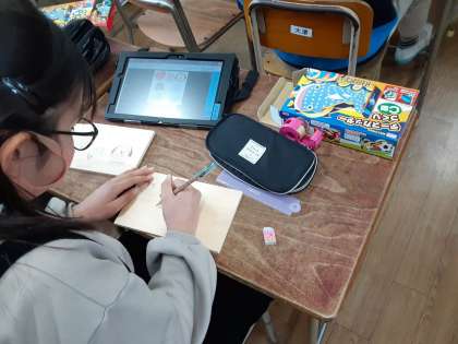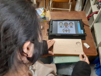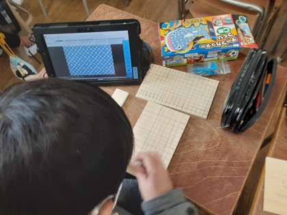 6年生は図画工作科で「テープカッターづくり」に取り組みます。絵柄を本体に描いたり、木の板を切って組み立てたり、6年間図画工作科で練習してきたことが凝縮されているようです。まずは、タブレットで気に入った絵柄を選んで、本体に描き込んでいくようです。卒業の記念になる素敵な作品を作ってほしいです。