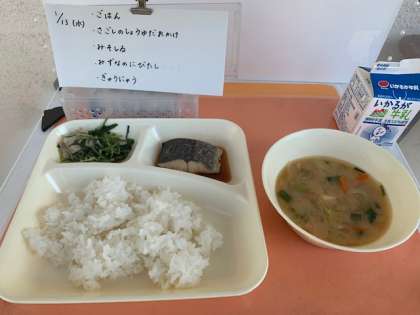 1月13日(水)の給食は、ごはん・牛乳・さごしのしょうゆだれかけ・みそ汁・みずなの煮びたしです。みずなは京都で昔から栽培されていた京野菜です。京都では「みずながお店に出るようになると、冬本番」と言われています。寒さが厳しくなる秋の終わりから冬にかけて、たくさんとれて美味しくなる野菜です。