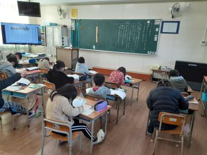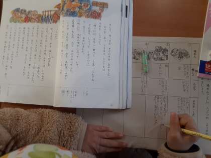 2年生では国語科で「かさこじぞう」の学習をしています。1組では、第1場面と第2場面での「じさま」と「ばさま」の様子を読み取っていました。近づく正月のための用意ができず、がっかりしている様子を「ためいき」など文章にある言葉を基にして読み取っていました。