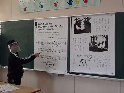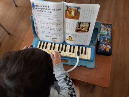 子ぎつね 公開日 2021/01/18 更新日 2021/01/18 お知らせ 2年生では音楽科で「子ぎつね」を学習しています。2組では歌で歌ったり鍵盤ハーモニカで演奏したりしていました。大声で歌ったり、全員で演奏したりできませんが、口ずさんだり、指使いを練習したりして工夫していました。特に八分音符で音階が細かく上下に動くところを演奏するのは難しそうでしたが、根気強く練習していました。 いいね(0)