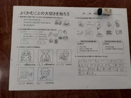 よくかむことの大切さを知ろう 公開日 2021/01/20 更新日 2021/01/20 お知らせ 4年生では食育で「よくかむことの大切さを知ろう」を学習していました。よく噛んでいるのか、それとも流し込むように食べているのか、普段自分はどんな食べ方をしているか振り返ってから、噛むことの大切さについて学びました。 よく噛んで食べると、いいことがいっぱいあるようです。今給食ではしゃべらずに食べる指導をしています。この機会にしっかり噛んで食べる習慣をつけてほしいです。 いいね(0)