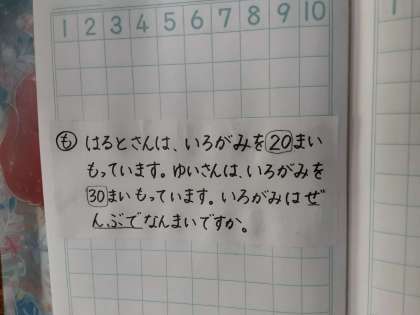 たしざんと ひきざん 公開日 2021/01/21 更新日 2021/01/21 お知らせ 1年生では算数科で「たしざんと ひきざん」の学習をしています。一の位が空位の2けたで、「2けた+2けた」「2けた−2けた」の計算について考えます。「10のかたまりがいくつ分」をしっかりとらえて正確に計算できるようにがんばってほしいです。 折り紙の問題文を読んで、鍵となる数を丸で囲ったり、鍵となる言葉にはアンダーラインを引いたりして式を立てます。子どもたちはしっかり見つけることができていました。 いいね(0)
