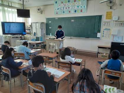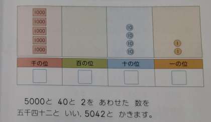 2年2組では算数科で「1000よりも大きい数」を学習していました。位に数がないときにどのように書き表すかを考えていました。「数がない時は0で表す」ことになっていますが、「読み方を書く時(漢字で表す時)には0は書かない」ので、子どもたちにとって紛らわしいようです。たし算やひき算のひっ算をするときは特に大切なことなので、早く慣れてほしいです。