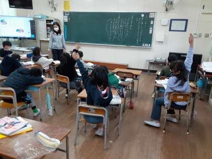 2年生では国語科で「かさこじぞう」を学習していました。1組では、かさこが売れず、じぞうさまにそのかさこをかぶせて帰ってきたじいさまを迎えたばあさまの気もちについて考えていました。ばあさまは「じいさまを心からほめている」「かさこより、じいさまのほうがだいじだ。」「ふぶきの中、ぶじにかえってきてくれてうれしい」など活発に意見が出ました。