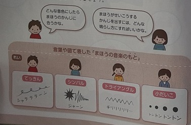 まほうの音楽 公開日 2021/01/26 更新日 2021/01/26 お知らせ 3年2組では音楽科で「おかしのすきな まほうつかい」の学習をしていました。この歌の中に、魔法使いが呪文を唱えるところや「ワン・ツー・スリー」と魔法をかけるところがあります。そこを楽器や歌声で表現します。呪文を唱えるときはウッドブロックやタンバリン、魔法をかけるところでは鈴やトライアングルなど、楽器の特徴をとらえて表現します。まあ法使いになった気分で演奏しながら楽しんでほしいです。 いいね(0)