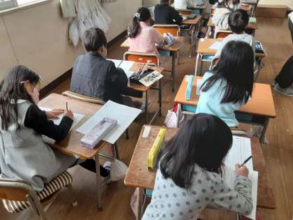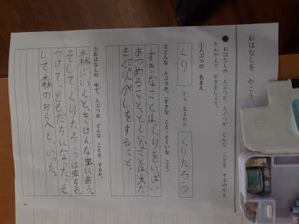 1年生は国語科で「おはなしを かこう」を学習しています。自分たちで物語を作るようです。登場人物(○〇から生まれた△△)・どんな人物か・その人物はお話の中でどんなことをするのかについてワークシートに書き込んでいました。「ももたろう」の影響が大きいのでしょうか。「くり」から生まれた「くりたろう」のような「〜太郎」という人物が多い気がしました。