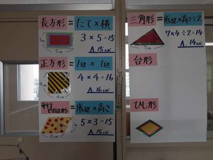 いくつか考えが出ました。平行四辺形や三角形で考えた経験を活かして、どの考えでも面積が求められました。最も「速く・簡単に・正確に」できる「は・か・せ・どん」は、「たしてわる法」(台形を2つたして平行四辺形にしてから2で割る方法)になったようです。