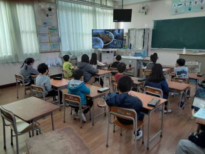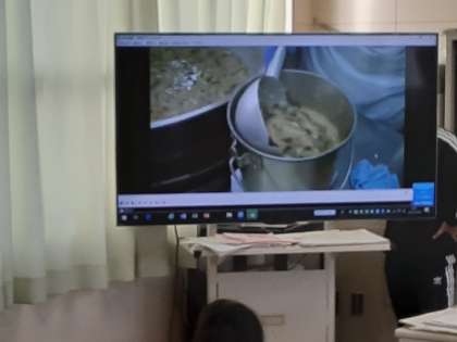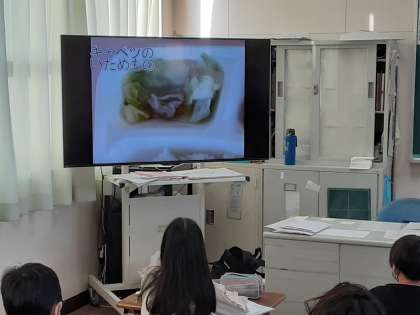 1月28日(木)児童集会では、給食委員会の発表がありました。大型テレビを使って給食を調理している映像を映し、給食委員の児童がナレーションをしていきました。