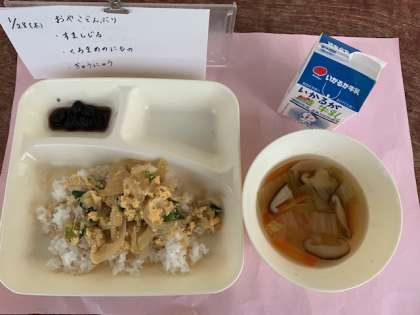 1月28日(木)の給食は、親子丼・牛乳・すまし汁・黒豆の煮ものです。親子丼は、卵の個別対応食です。黒豆は、お正月に食べるおせち料理の1つです。黒豆には「まめに(まじめに)働き、まめに(健康に)暮らせますように」という願いが込められています。甘めの味つけだったので、デザートのような美味しさでした。
