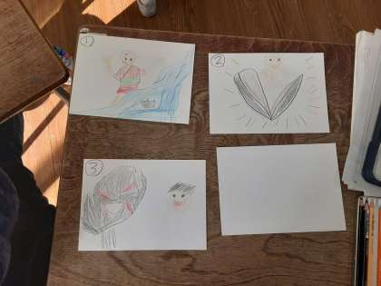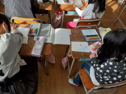 おはなしを かこう 公開日 2021/01/28 更新日 2021/01/28 お知らせ 1年生は国語科で「おはなしを かこう」を学習しています。前時には、自分で物語を考えていました。本時では、自分の物語が書けた児童から、お話に沿った紙芝居を作っていました。自分が考えたお話だから、登場人物の様子や動作についてイメージができているようで、あまり悩まずに紙芝居の絵を場面ごとに描いていました。 いいね(0)