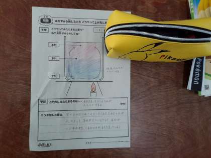 4年生は理科で「もののあたたまり方」を学習しています。前時に試験管に入った水を温めて、温度の変わり方を調べました。本時では、ビーカーの中の水のあたたまり方を調べていました。水全体が一斉にあたたまるのではないようです。