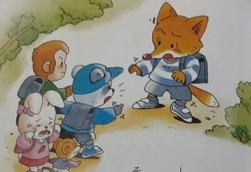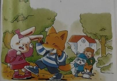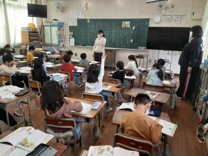 1年生では道徳科で「やめろよ」を学習していました。「こんきち」が「ぴょんこ」にいじわるをして、泣かしていました。通りかかった「ぽんた」は、最初通り過ぎようとしましたが、勇気を出して「いじわるは、やめろよ」と言いました。正しいことを言えたぽんたの気持ちと、言えなかったときのぽんたの気もちについて比べました。言えた時は「すっきりした」「今度からも言える」「これでもう大丈夫だ」、どうしても言えなかったときでも「家の人や先生に伝える」などの意見が出ていました。