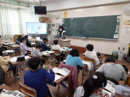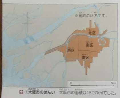 3年生は社会で、大阪市ができたころの様子について学習しています。2組では、明治22年大阪市ができた当時の地図や写真を基に調べていました。当時は区が4つ(北区・西区・東区・南区)しかなかったことを知り、今と比べて驚いていました。大きな外国の船を呼び込むために大掛かりな港の工事があったことなどを知り、大阪市の発展を感じているようでした。