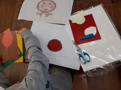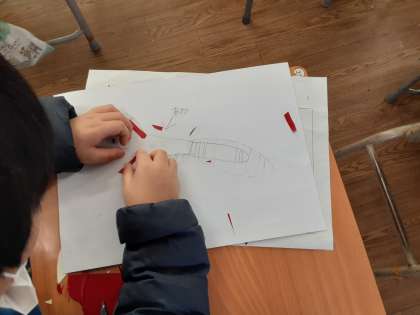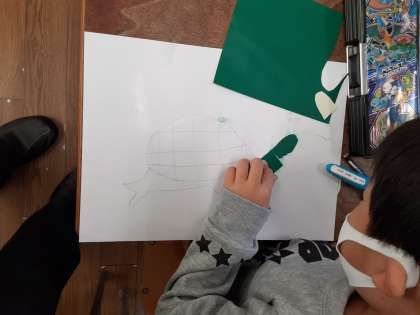 1年生は図画工作科で版画に取り組んでいます。紙版画のように、用紙を下描きの形に切って、下描きの上に貼っていきます。通常の紙版画と違うのは、貼っていく用紙が「いろタック」(色のついているシール)になっていることです。シールになっているのでのりを使いません。また、白黒でなく8色刷りになります。