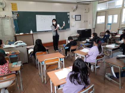 2年生では国語科で「おばあちゃんに きいたよ」を学習しています。1組では、いろは歌を習ったのをきっかけに、自分たちでもいろはかるたを作って、みんなに紹介していました。