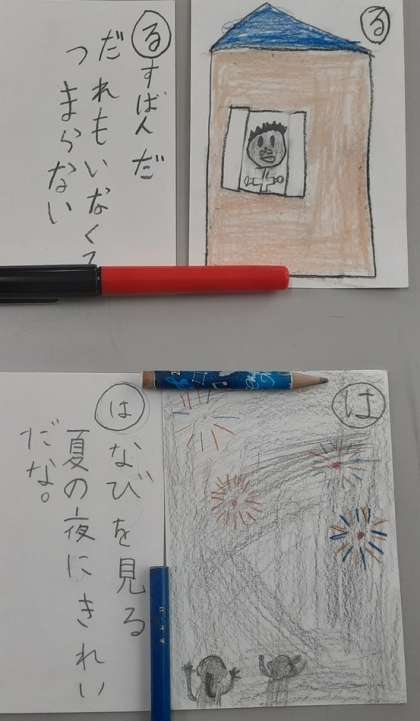 読み札が自然に「5・7・5」のリズムになっていました。「るすばんだ だれもいなくて つまらない」「とをあけて とうさんたいそう 夏休み」先生が読み上げると、思わず拍手が起こりました。