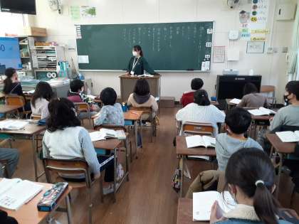 4年生では国語科で「調べたことをほうこくしよう」の学習をしています。まず、何について調べたいのかを発表し合いました。テーマは生活についてです。読書・テレビ・休日の過ごし方・宿題以外の学習・身の回りの整頓・コロナ対策などが出ました。先生が「みなさんにとって、ずっと続いているテーマですね。」と言うと「コロナ対策はずっと続いていません。」というするどい意見も出ました。
