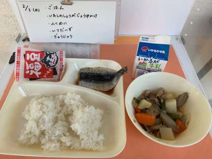 2月3日(水)の給食は、ごはん・牛乳・いわしのしょうがじょうゆかけ・含め煮・いり大豆です。本日は節分の行事献立です。節分では、病気や悪い出来事を追い払うために「鬼は外、福は内」と言って豆まきをしたり、年の数だけいり大豆を食べたりする習慣があります。