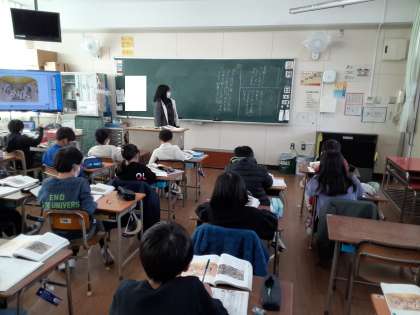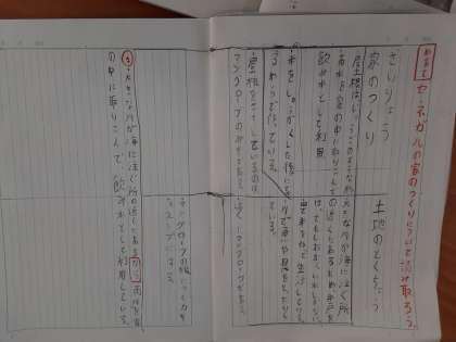 3年生では国語科で「人をつつむ形−世界の家めぐり」を学習しています。2組ではセネガルの家の特徴について読み取り、まとめているところでした。井戸が塩水なので雨水を集める工夫、周りにたくさん生えているマングローブの利用などがわかりました。読み進めていくうちに、家は建てられている土地の条件が活かされていることに気づいてきたようです。