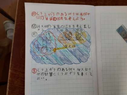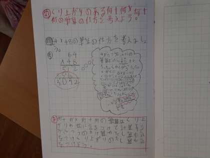 3年生は算数科で「大きい数のかけ算のし方を考えよう」を学習しています。1組では「64×48の筆算」の計算の仕方について考えていました。これまで学習を積み上げてきたので、本時では筆算の仕方をあまり苦しまずに考えられたようです。