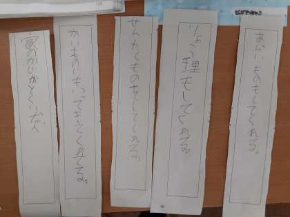 この 人を しょうかいします1 公開日 2021/02/04 更新日 2021/02/04 お知らせ 2年生は国語科で「この 人を しょうかいします」の学習をしています。1組では、「身のまわりにいる人で、紹介したい人」を決め、紹介したい内容を短冊にいくつも書き出していました。できた児童から、短冊を切り分けて、伝える順を考えながら並べていきました。 どのような順で並べたら相手により伝わるかを考えていました。なかなか決まらないようで、短冊を何度も入れ替えていました。 いいね(0)
