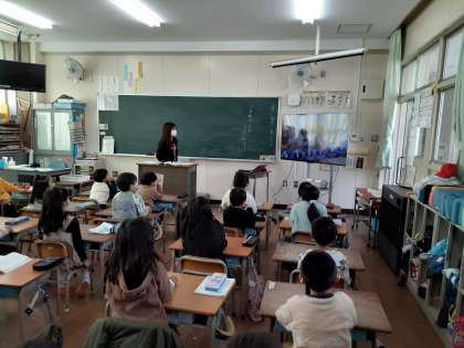 1年生では国語科で「小学校の ことを しょうかいしよう」を学習します。大型テレビに、入学したころの様子が映し出されました。児童は「なつかしい」と大喜びでした。