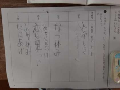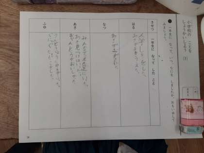 この単元では、もうすぐ2年生になるにあたって、新しい1年生に北粉浜小学校のことを紹介する文章をつくります。まず、今年度1年間を振り返って「春・夏・秋・冬」それぞれの季節で心に残った出来事を振り返っていました。最近のことですが、雪が降ったことやビオトープに氷が張ったことが印象に残っているようでした。