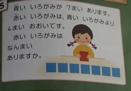 ずを つかって かんがえよう 公開日 2021/02/05 更新日 2021/02/05 お知らせ 1年生は算数科で「ずを つかって かんがえよう」を学習しています。これまで文章問題を解く時に、「あわせて」「のこりは」など、キーになる言葉に着目して式を考えていました。本時では、下記のような問題で、図や言葉を書くことで考えていきます。今までの問題のようにはいかないようです。青い色紙より4枚多いことを、図や言葉でうまく表せられるようにがんばっていました。 いいね(0)