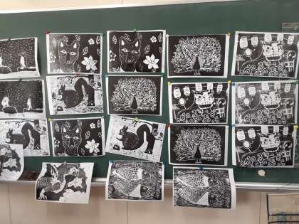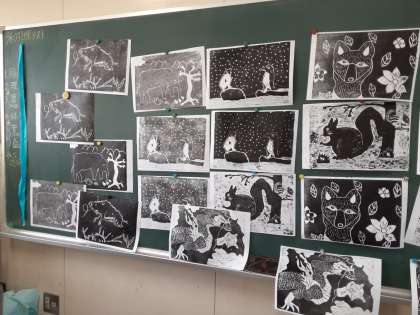5年生は図画工作科で版画に取り組んでいます。多くの作品ができあがってきました。動物の毛並みなどを細かい線で表している作品がいくつもありました。根気強く頑張ったと思います。