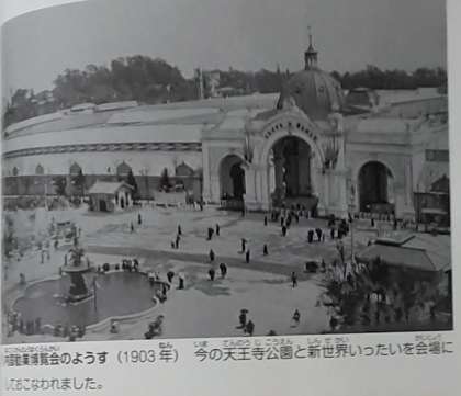 教科書の写真からは想像できないかもしれませんが、内国勧業博覧会は世界各国から出品され、とても盛大でした。(当時としては最高のイルミネーション・珍しい冷蔵庫の展示がありました。)機会があったら、本やインターネットで調べてほしいと思います。